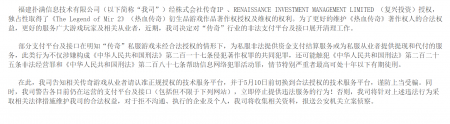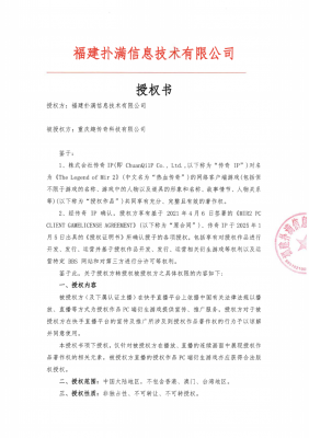 福建撲滿信息技術(shù)有限公司注冊地位于福建省福州市,是國內(nèi)《熱血傳奇》客戶端游戲獨(dú)占性版權(quán)人。對《熱血傳奇》客戶端游戲擁有全部版權(quán),并有權(quán)基于版權(quán)權(quán)利進(jìn)行該游戲維權(quán)。株式會社傳奇IP (以下簡稱傳奇IP )對《The Legend of Mir 2》(中文名為“熱血傳奇"、或“傳奇”、“傳奇2”、“MIR II”)游戲(以下稱為 “授權(quán)作品”) 共同享有充分、完整且有效的著作權(quán)。經(jīng)傳奇IP授權(quán) , RENAISSANCE INVESTMENT MANAGEMENT LIMITED (以下簡稱 RENAISSANCE Ltd.)有權(quán)在中國大陸地區(qū)獨(dú)占性地對授權(quán)作品的網(wǎng)絡(luò)客戶端游戲進(jìn)行開發(fā)、 發(fā)行、管理、宣傳、推廣和運(yùn)營,針對授權(quán)作品的侵權(quán)游戲及侵權(quán)方,RENAISSANCE Ltd.有權(quán)采取必要的措施,并有權(quán)將前述權(quán)利分授權(quán)給第三人。福建撲滿信息技術(shù)有限公司經(jīng)RENAISSANCE Ltd.授權(quán),獲得上述權(quán)利,有權(quán)在中國大陸地區(qū)獨(dú)占性地對授權(quán)作品的網(wǎng)絡(luò)客戶端游戲進(jìn)行開發(fā)、發(fā)行、管理、宣傳、推廣和運(yùn)營,并有權(quán)對侵權(quán)行為/主體采取維權(quán)措施。